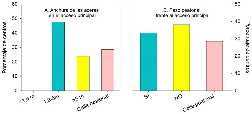 Figs. 6 A y B / Porcentaje de centros agrupados según la anchura de aceras en el acceso principal (A); o con paso peatonal en el acceso principal (B)