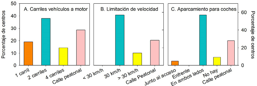 Figs. 9 A, B y C / Porcentaje de centros agrupados en función del número de carriles para vehículos a motor en el acceso principal (A); la limitación de velocidad en los carriles frente al acceso principal (B); y la existencia y disposición de aparcamientos para vehículos motorizados frente al acceso principal (C)