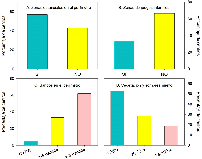 Figs. 11 A, B, C y D / Porcentaje de centros que tienen zonas estanciales en su perímetro escolar (A); que poseen zonas de juegos en su perímetro escolar (B); agrupados según el número de bancos en el perímetro escolar (C); y agrupados en función del porcentaje de vegetación y sombra existente en el perímetro escolar (D)