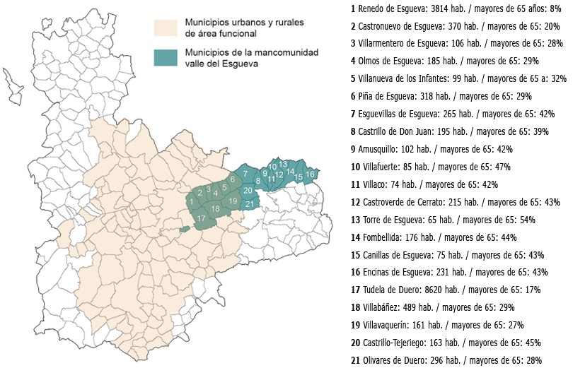 Fig. 2 / Municipios que forman la mancomunidad del valle del Esgueva en la provincia de Valladolid y sus datos sobre población y% de personas mayores de 65 años