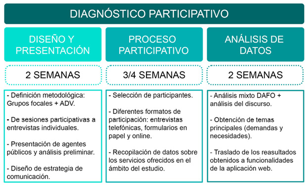 El proceso de ejecución del proyecto se ha dividido en 5 fases o actividades: 1. Gestión del proyecto: actividad transversal que garantiza el buen desarrollo del trabajo en equipo; 2. Diagnóstico de la situación actual: fase en la que se han identificado las necesidades en servicios y atención de la población del ámbito piloto; 3. Análisis de requisitos y especificaciones para el prototipo: para la definición de las funcionalidades y los requisitos técnicos de la aplicación web; 4. Desarrollo de la plataforma ARADOS, en la que se han realizado el diseño web y la interfaz de la aplicación3 ; 5. Testeo y validación: evaluación del funcionamiento técnico previa al lanzamiento de la plataforma.