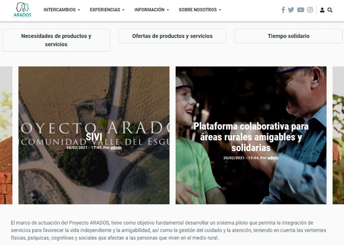 El resultado final del proyecto ha sido la creación de una plataforma web abierta al público en general para el intercambio de información y ofertas y demandas sobre productos en el entorno rural del ámbito piloto (URL: https://arados.es). El funcionamiento se basa en la creación de perfiles de usuario para poder validar las identidades de los participantes, habilitándose la posibilidad de cargar ofertas y demandas de manera continua, actualizándose los datos de forma inmediata. También acoge secciones sobre información de interés y buenas prácticas. Se reserva un amplio espacio para la interrelación social a través del foro de debate, en el que se pueden compartir experiencias y vivencias previas, las Redes Sociales ligadas al proyecto y la sección de tiempo solidario, donde los usuarios intercambian actividades, conocimientos y cuidados que se valoran en tiempo de dedicación. Se puede ver una imagen de la interfaz de la página de inicio de la plataforma web del proyecto en la Fig. 4.