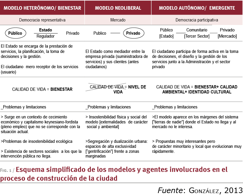 En el complejo contexto actual, diferentes modelos coexisten y participan del proceso de construcción de la ciudad y el territorio. En cada modelo los agentes participan, se involucran y juegan un papel también muy diferente. El esquema siguiente recoge de forma sintética y simplificada cada uno de estos modelos: