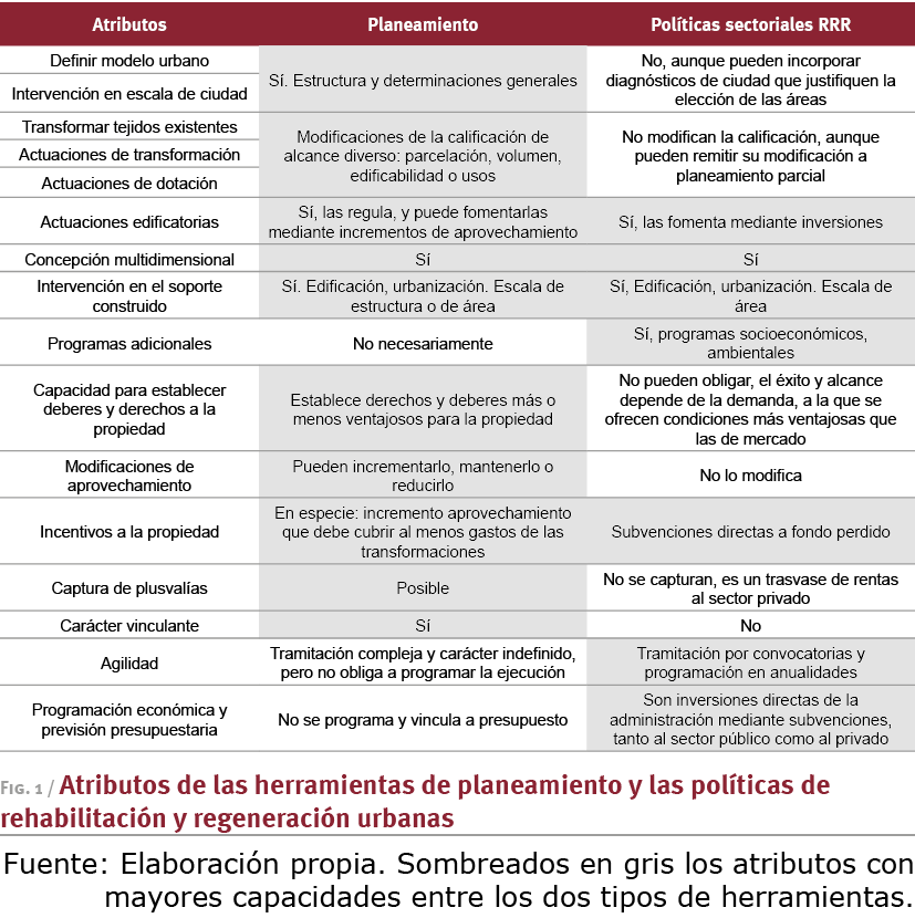 Los atributos del planeamiento y de las políticas sectoriales de RRR para la intervención en la ciudad existente difieren de forma notable (Fig. 1). Las políticas de RRR reúnen algunos atributos (agilidad, programación y presupuesto, programas complementarios) de los que adolece el planeamiento y que lo hacen difícilmente operativo. El planeamiento permite encajar las intervenciones en un marco estructural de ciudad y tiene capacidad para transformar los tejidos existentes mediante propuestas vinculantes que pueden modificar el aprovechamiento y permitir la captura de plusvalías, posibilidades no incluidas necesariamente en las políticas de RRR en áreas. Se trata de dos tipos de actuación complementarios que presentan puntos de confluencia, pero que tienen funcionalidades y capacidades diferenciadas. Ambas se utilizan con profusión, aunque no siempre de forma coordinada.