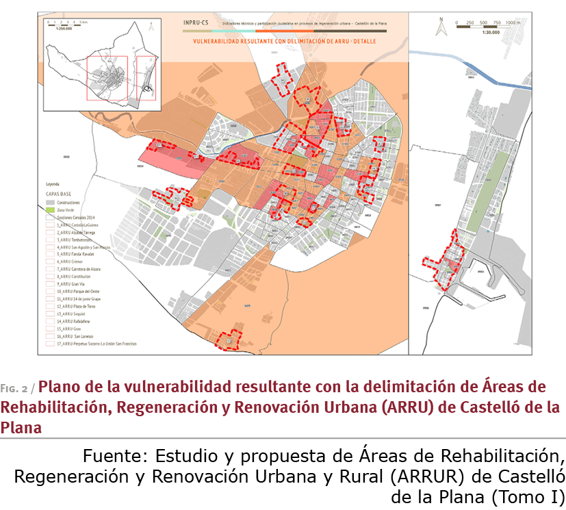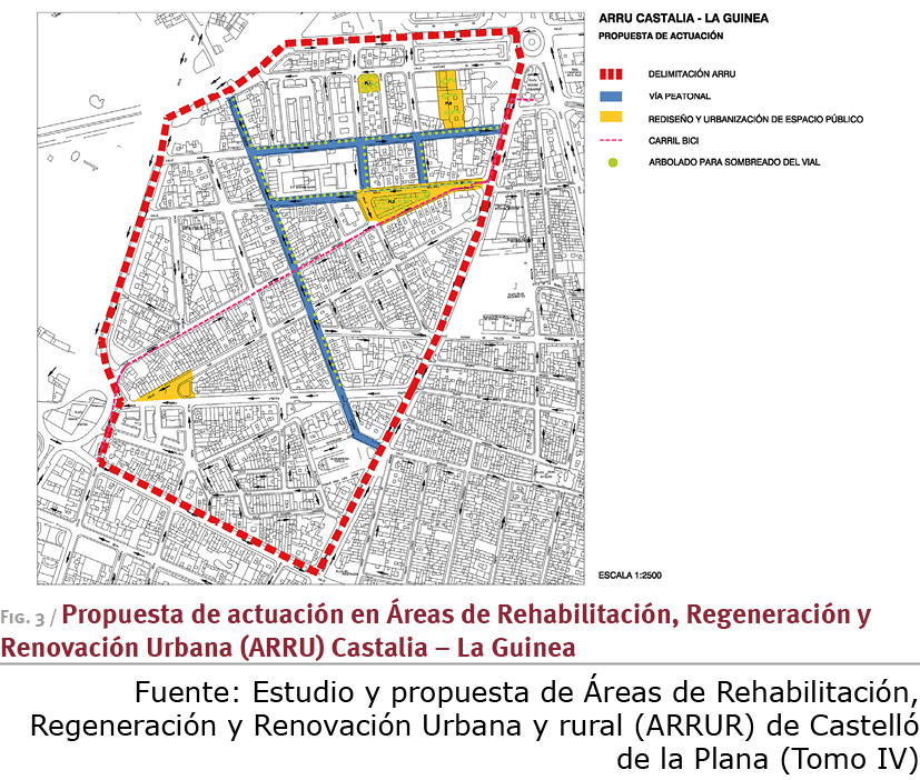 Definición desde el planeamiento general al que se le suma una política sectorial. Estudio y propuesta de Áreas de Rehabilitación, Regeneración y Renovación Urbana (ARRU) de Castelló de la Plana (García Bernal & Huedo Dordá, 2017). Como parte de la tramitación del Plan de Ordenación Pormenorizada del Plan General de la ciudad, se incluye este estudio realizado en 2017 (Fig. 2), a partir de un diagnóstico de vulnerabilidad urbana obtenido mediante la valoración de indicadores y procesos de participación ciudadana, para delimitar 17 ARRU. El estudio incluye una propuesta de intervención tipo para uno de ellos, el ARRU Castalia – La Guinea (Fig. 3), que propone la mejora del espacio público, peatonalizaciones, ampliación de aceras e inclusión de arbolado, la creación de un carril bici que atraviese el barrio, transformar un espacio en desuso en una nueva dotación pública y la rehabilitación del edificio Mestrets de viviendas sociales municipales. La ejecución de este ARRU se va a financiar a través del Plan Estatal de Vivienda 2018-2021 y aportaciones autonómicas y municipales. Actualmente, se están adjudicando y redactando los proyectos para algunas de las actuaciones planteadas.