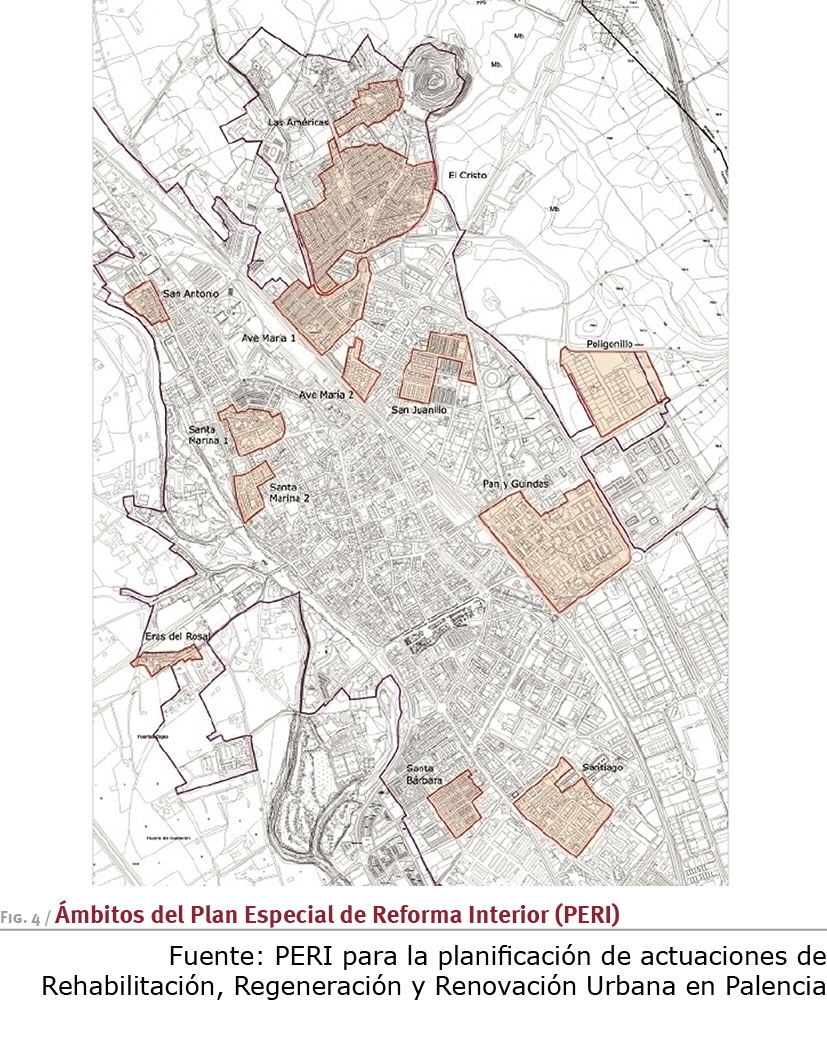 Definición desde el planeamiento de detalle que necesita de políticas sectoriales para materializarse. Estrategia municipal de Rehabilitación, Regeneración y Renovación urbana de Palencia, aprobada en desarrollo de la Estrategia de Regeneración Urbana en Castilla y León (ERUCyL); y financiada a partir de la Estrategia de Desarrollo Urbano Sostenible e Integrado (EDUSI), con 2 854 307€ según su Plan de Implementación (Ayuntamiento de Palencia, 2014). Las actuaciones se definen a partir de un Plan Especial de Reforma Interior, con su Avance publicado en 2018 y pendiente de aprobación inicial, que identifica los barrios o conjuntos urbanos “que presentan un comportamiento deficitario en cuanto a los estándares de habitabilidad deseables para el conjunto de la ciudad y plantea las actuaciones” (Andrés & Masiá, 2018, p. 1). A partir de la delimitación de estas áreas, el Ayuntamiento de Palencia (Fig. 4) podrá solicitar su declaración como Área de Regeneración Urbana a la Junta de Castilla y León y acudir a la financiación estatal y europea lo que permitirá formalizar las actuaciones. El documento de Avance no incluye propuestas de actuación para las áreas propuestas, que se harán de manera particularizada para cada una de ellas, perdiéndose así la “visión global del municipio que favorezca la integración urbana y el equilibrio territorial” (Molina Costa, 2019, p. 57).