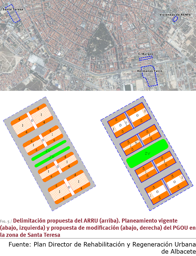 Definición desde política sectorial que busca cambios en el planeamiento para viabilizar la transformación. Plan Director de Rehabilitación y Regeneración Urbana de Albacete (2018) (Fig. 5). A partir de las necesidades de actuación en algunos barrios de la ciudad detectadas en 2015 en el diagnóstico de la Estrategia de Desarrollo Urbano Sostenible e Integrado (EDUSI), se elabora el Plan Director de Regeneración Urbana Integral de áreas desfavorecidas de la ciudad con el propósito de delimitar áreas de intervención y proveer de elementos necesarios para solicitar financiación autonómica y estatal para la rehabilitación y regeneración urbana. Además, propone la creación de una Oficina Técnica de Rehabilitación y Regeneración Urbana (OTRR) que impulse la rehabilitación y mantenga actualizado el Plan (Bernabé & García, 2018). También propone la adaptación de la normativa urbanística al TRLSRU, ampliando las posibilidades de transformación de las áreas delimitadas; la modernización de las bases de datos urbanísticas del municipio, como apoyo a la regeneración urbana, así como modificaciones puntuales del Plan General o la programación de Planes Especiales de Reforma Interior para concretar las actuaciones propuestas. Con todo esto, el Plan Director es un documento “abierto y flexible, pero sin definición de medidas a medio y largo plazo” (Molina Costa, 2019, p. 59) que sirve como estructurante de las acciones de regeneración urbana, sujetas a su vez a los dilatados tiempos de aprobación de los cambios normativos.
