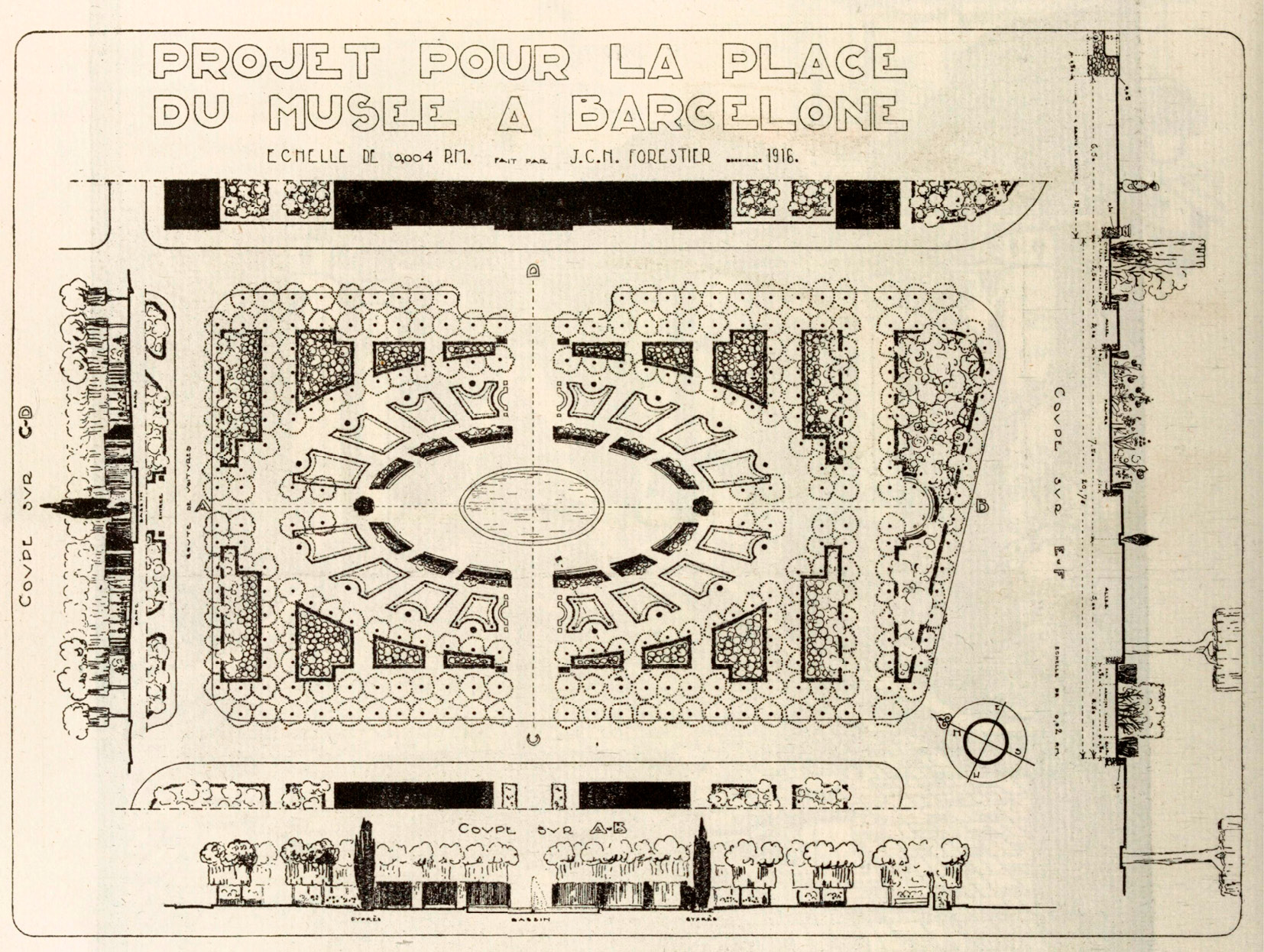 El técnico francés realizó el proyecto después de su llegada a Barcelona en 1915, cuando Francesc Cambó requirió su participación en la ordenación paisajista de la montaña de Montjuïc, con motivo de la Exposición Internacional de Industrias Eléctricas. La intervención en Montjuïc se extendió a la escala de la ciudad mediante diversas propuestas que condicionaron la historia urbana de Barcelona (Casals, 2009). Entre los jardines proyectados por Forestier, la mayoría hoy muy transformados, destaca el de la plaza de Joan Fiveller, que el autor incluye en su obra Jardins, carnets de plan et de dessins (1920), texto fundamental que supuso una nueva forma de interpretar el jardín mediterráneo, bajo la influencia del jardín clásico francés.2
