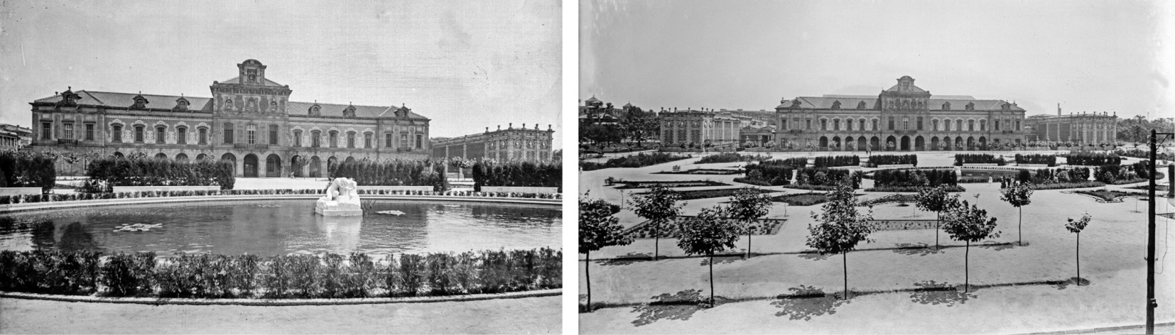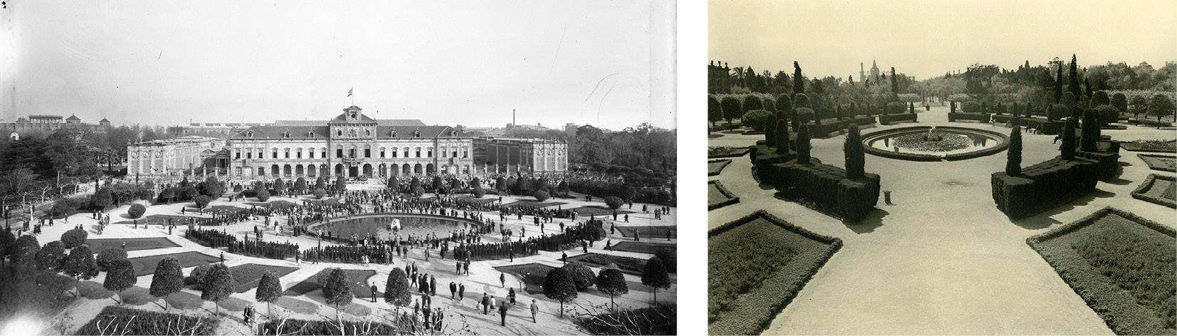 Fig. 8/ Izquierda: La plaza de Armas en la inauguración del antiguo arsenal como sede del Parlamento de Cataluña (6/12/1932) Derecha: Evolución posterior de la plantación (31/12/1940). Plasencia Pons i de Magarola, Leopoldo