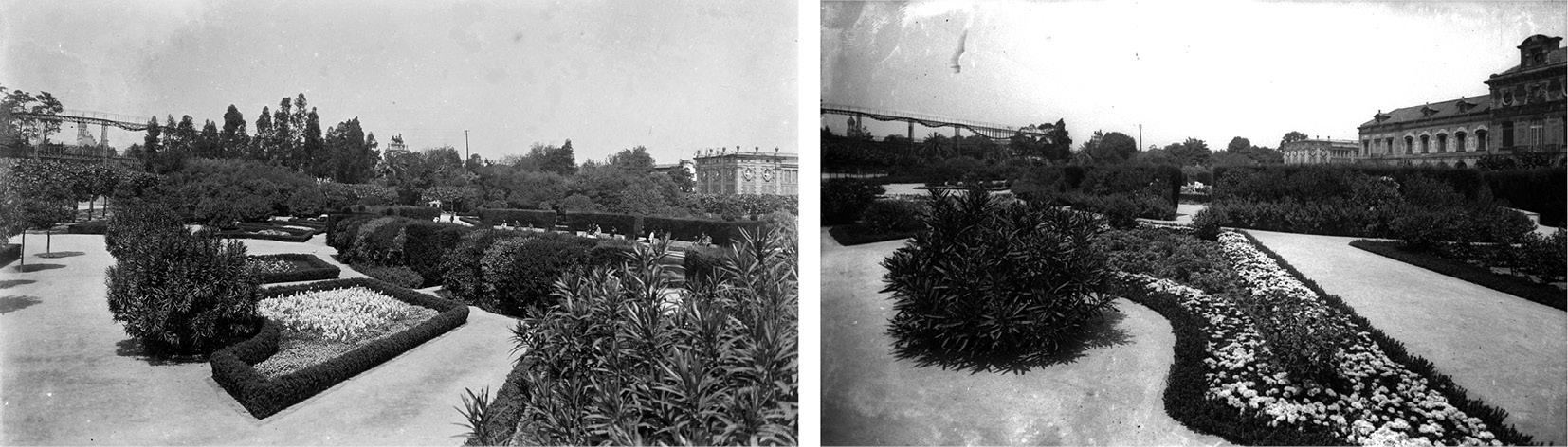 En una serie de fotografías que se corresponden con el primer momento de implantación del jardín, se pueden ver los plátanos recién plantados y el seto de cipreses que rodea la plaza central, aún de un tamaño reducido. En el estanque aparece, como estaba previsto en el proyecto, plantación acuática que desapareció más tarde (Fig.6). Además, las imágenes muestran una interesante disposición del seto de ciprés perimetral: hacia el interior, está perfectamente recortado, formando el límite elíptico de la plaza. Sin embargo, hacia el exterior, cada tramo forma una “U” de seto recortado que abraza una plantación arbustiva variada, que crece de forma libre. Los parterres del perímetro exterior alternan plantación floral y pradera (Fig.7).