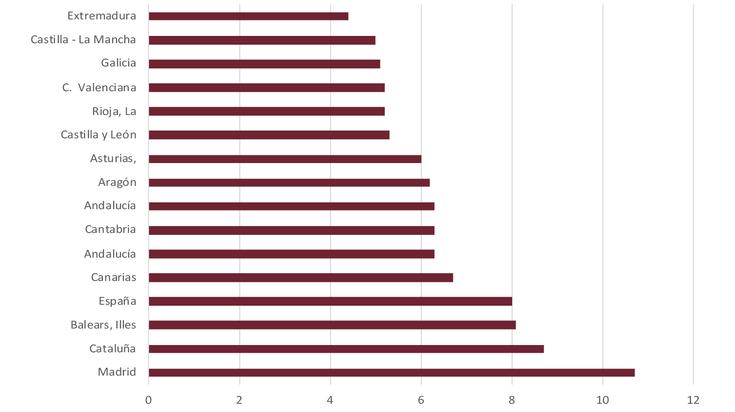 Los precios más reducidos fueron los de Castilla-La Mancha (5,0 euros/m2-mes) y Extremadura (4,4 euros/m2-mes) (Fig. 15). La cuantía media más elevada del alquiler en 2021 fue la de la Comunidad de Madrid (700 euros/mes) y la más reducida la de Extremadura (376 euros/mes).