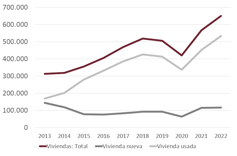 Fig. 19/ Compraventas registradas de viviendas. Totales anuales, 2013-2022, viviendas totales, nuevas y usadas
