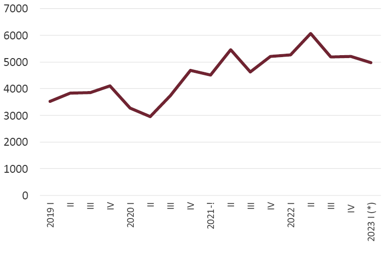 Los precios de la vivienda, según la Estadística Registral Inmobiliaria, frenaron en el segundo semestre de 2022 el fuerte aumento experimentado en la primera parte de dicho año. Según dicha fuente estadística, el precio medio de las viviendas cuya venta se registró en el cuarto trimestre de 2022 ascendió a 1951 euros/m2, un 5,3% superior al precio medio del mismo periodo de 2021 (Fig. 8).