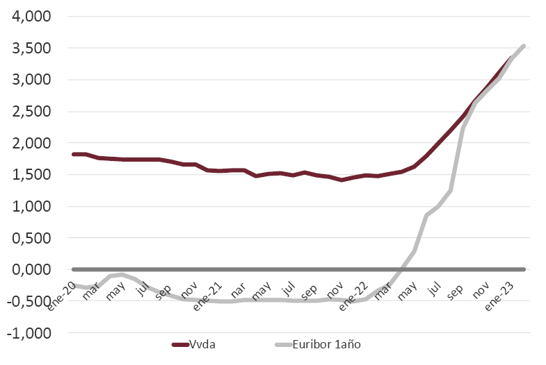 La importante elevación del Euribor está afectando en 2023 a los compradores de vivienda que se habían endeudado previamente con un préstamo a interés variable. El prestatario que suscribiese un préstamo en febrero de 2022, entonces al 1,481%, se comprometió a soportar en las actualizaciones del préstamo con un diferencial de 1,816 puntos porcentuales sobre el Euribor. En la actualización anual de dicho préstamo en febrero de 2023 el citado diferencial, unido al nivel alcanzado por el Euribor en dicho mes, supondrá al prestatario tener que pagar durante un año las cuotas correspondientes a un tipo de interés del 5,15%. Esta evolución puede implicar un crecimiento de más del 50% en la cuota a pagar por el servicio de un préstamo hipotecario al comprador de vivienda.