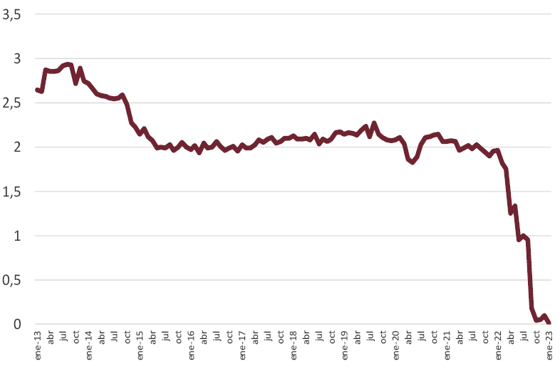 El jueves 2 de febrero de 2023 el Banco Central Europeo (BCE) volvió a subir los tipos de interés en 0,5 puntos porcentuales hasta el 3%%, el nivel más elevado desde 2008. La subida en cuestión, que fue la quinta en medio año, puede afectar al proceso de recuperación en el conjunto de la Eurozona. Los tipos de interés aplicados por las entidades de crédito a empresas y hogares se han elevado de forma significativa en los primeros meses de 2023 respecto de los del mismo periodo del año anterior. En este contexto resulta sobre todo relevante la evolución de la inflación, por su impacto sobre el signo de las políticas monetarias que pueden aplicar los bancos centrales.
