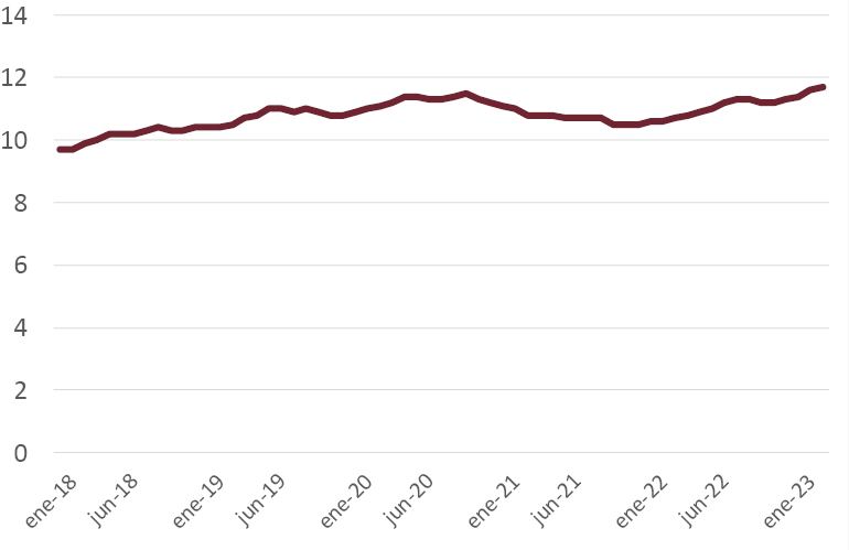 Los alquileres aceleraron el crecimiento en 2022, de acuerdo con los datos de las viviendas puestas en oferta recogidos por el portal inmobiliario Idealista.com (Fig. 12). Los precios medios de los alquileres, según dicha fuente estadística, ascendieron a 11,4 euros/m2-mes en diciembre de 2022, un 7,5% por encima del precio del mismo mes del año anterior.