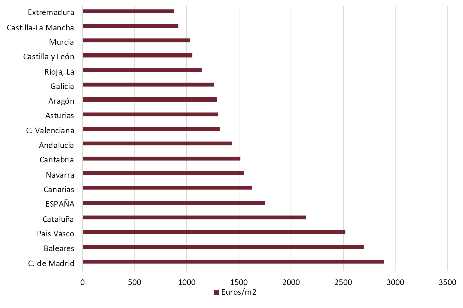 Por autonomías, los valores de tasación más elevados fueron los de la Comunidad de Madrid (2888,1 euros/m2) y Baleares (2696,6 euros/m2), y los más reducidos los de Castilla-La Mancha (919,1 euros/m2) y Extremadura (876,8 euros/m2) (Fig. 11). Los valores de tasación de las viviendas de nueva construcción superaron a los de las viviendas usadas en un 18,6% en el cuarto trimestre de 2022.
