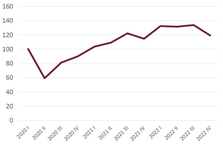 Fig. 20/ Compraventas registradas de viviendas. Datos trimestrales, 2020-2022, 100=2020 I