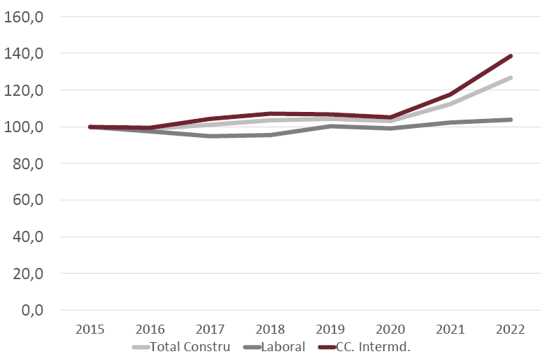 Fig. 24/ Coste de la construcción, 100=enero 2015. Coste total, costes laborales y consumos intermedios (materiales). Datos anuales, 2015-2022