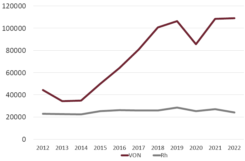 En 2022 los visados de obra nueva de los Colegios de Arquitectos Técnicos aumentaron en un 0,53% sobre el año anterior (Fig. 22). El total de viviendas visadas ascendió a 108 895. Dicho total implicó un aumento a todas luces inferior al de las compras de vivienda, lo que puede indicar que los estrangulamientos en la oferta han podido frenar una expansión mayor de la construcción de nuevas viviendas. Los visados para las obras de rehabilitación descendieron en 2022 en un 11,5%, lo que puede indicar que todavía en 2022 no se ha advertido de forma significativa la incidencia de los importantes recursos destinados por el gobierno estatal para la rehabilitación. En 2022 disminuyó la cuota de los visados para rehabilitación dentro del total de visados, puesto que retrocedió desde el 19,6% de 2021 hasta el 17,7% de 2022.