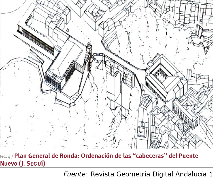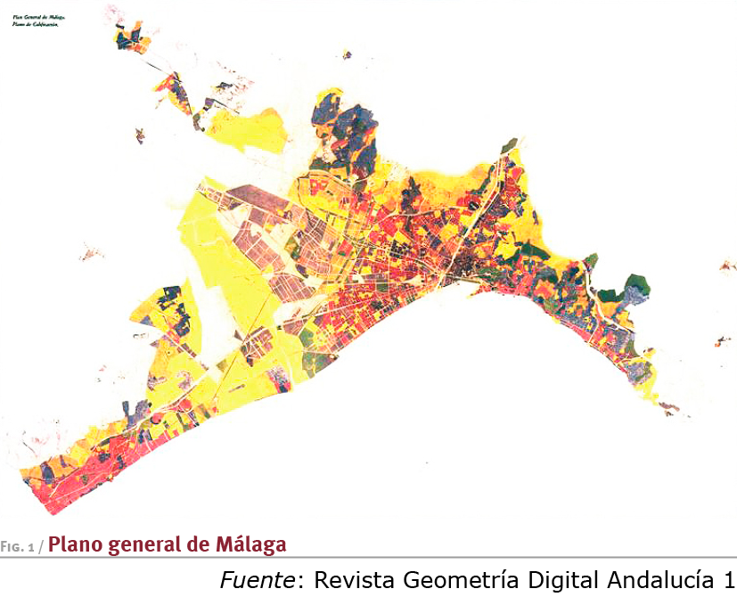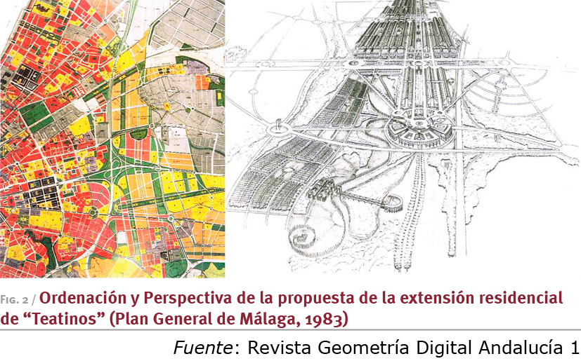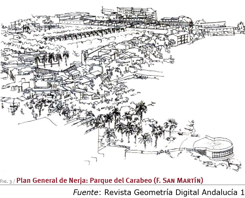 Es cierto que la ordenación urbanística en Andalucía logró en los iniciales años de nuestra democracia importantes e históricos logros en sus desarrollos urbanísticos, principalmente el de la escala urbana municipal en donde obtiene sus mejores aportaciones teóricas y resultados prácticos. Baste recordar a modo de algunos ejemplos de los primeros Planes Generales Municipales de aquella generación de los 80 coincidente dicho proceso de la transición política en nuestro país, como el de Málaga (del que fueron autores D. Quero, S. Moreno y J. Seguí, con el asesoramiento de Manuel Sola-Morales) (Fig. 1), Cádiz (J. Jiménez Mata), Córdoba (J. Cuenca, G. Díaz, P. Bermúdez), Granada (F. Peña), Almería (G. Roger)...,así como en otras muchas “ciudades medias” de las que destacaríamos los Planes Generales del Puerto Santa Maria(J. M. Verdú), Vélez-Málaga (S. Moreno), Nerja (F. D. Martin) (Fig. 3), Ronda (J. Segui) (Fig. 4) o Benahavis (J. A. Fernández y J. M. Morente).
