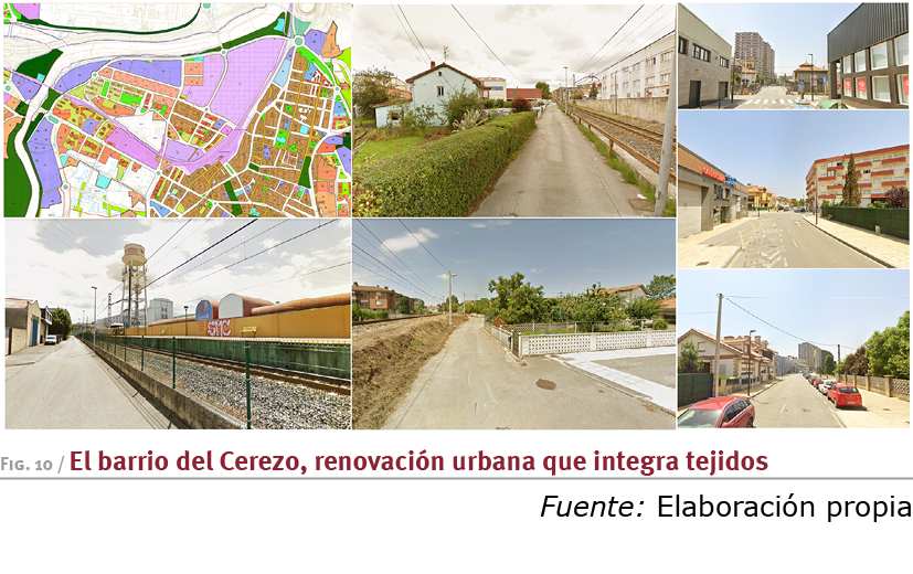 El barrio del Cerezo, situado al norte del trazado del ferrocarril,, acoge una de las operaciones de renovación de mayor calado donde la presencia del complejo industrial de Aspla, junto con implantaciones aisladas industriales se entremezclan con la colonia Sniace de viviendas para los trabajadores y algunas viviendas de reciente factura; su integración con el otro lado de la ciudad/FFCC ha sido largamente demandada por la población, que siente el ferrocarril como una frontera física y perceptiva muy potente.