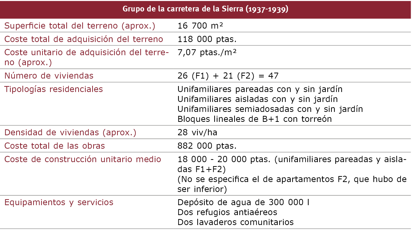 Bajo la superficie figurativa, orientada a enlazar con episodios del pasado especialmente apreciados (Renacimiento, colonización de América), los edificios responden a los modelos racionales del bloque de doble crujía en ordenación abierta y la vivienda unifamiliar compacta, sin que parezca existir un criterio claro para la adopción de uno u otro y su combinación, más allá de la intención de costear el suelo en el caso del Camino de Ronda. Si en la primera realización dominaban ampliamente las unifamiliares (39 de 47 viviendas), en la segunda la proporción retrocedió (32 de 86 viviendas) y en la tercera —cuyo terreno era tan propicio para el cultivo de huertos como el del primer grupo— se propusieron exclusivamente bloques; todo ello en proyectos redactados por los mismos técnicos y simultáneamente o con pocos meses de diferencia. Es, por otro lado, evidente que el proyecto inaugural poseía una carga propagandística superior y que su diseño se encontraba más mediatizado ideológicamente, por lo que su resolución aparece más cercana a los ideales ruralistas defendidos durante la contienda y en él el recurso al bloque se operó con mayor cautela. Se constata, en este sentido, un progresivo incremento de la densidad de viviendas, pasando de menos de 30 viv/ha en la carretera de la Sierra a más de 90 en el Camino de Ronda.