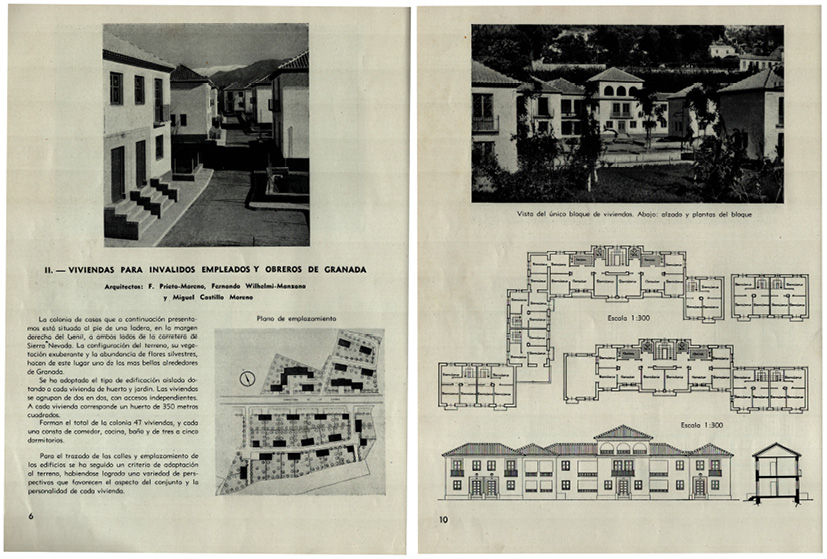 La redacción del proyecto del grupo se encomendó a Miguel Castillo, Fernando Wilhelmi y Francisco Prieto-Moreno, arquitectos municipales33, de la diputación provincial y conservador de la Alhambra34, respectivamente, que realizaron el trabajo gratuitamente, como exigía el bando. Este y otros datos se precisan en una memoria del Gobierno Civil de Granada sobre la situación general de la provincia custodiada por el AGA35, que incluye un epígrafe de ocho páginas sobre la “Labor realizada por la ‘Obra Nacional’”, datable hacia septiembre de 193836. Además, el proyecto fue publicado en la revista Nuevas Formas durante su efímero periodo lisboeta37 (Fig. 1); reportaje del que se desprenden otros datos relevantes como que el suelo —de propiedad particular38— fue adquirido por un precio total de 118 000 ptas. (Prieto-Moreno & Wilhelmi Manzano & Castillo Moreno, 1940, p. 7). Del emplazamiento los proyectistas destacaban “la configuración del terreno, su vegetación exuberante y la abundancia de flores silvestres”, que hacían de él “uno de los más bellos alrededores de Granada” (Prieto Moreno & Wilhelmi Manzano & Castillo Moreno, 1940, p. 6). También valoraban “la cercanía al casco urbano de la capital, la facilidad de medios de transporte, como el autobús y el tranvía, y la belleza de sus perspectivas y alrededores”, factores que, aseguraban, se habían “tenido muy en cuenta”39.