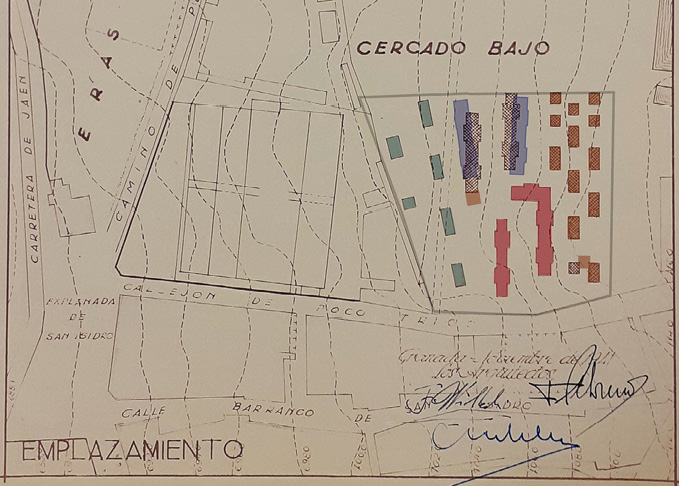 En otoño de 1937, la comisión granadina de la ONC negociaba la adquisición de varias fincas en la zona a un propietario residente. Los arquitectos Wilhelmi, Castillo y Prieto-Moreno fueron nuevamente requeridos para informar de la adecuación del solar en sesión celebrada el 28 diciembre de 1937 —misma en la que se pronunciaron sobre el terreno del cercado bajo de Cartuja—. En dicha reunión, el gobernador civil dio cuenta de las gestiones realizadas con el particular y de la disposición de este a modificar las condiciones iniciales de venta con la introducción de diversas rebajas108. Poco después, a principios de enero de 1938, se cerraba el contrato de adquisición de dos fincas: la primera presentaba una superficie de 7349,86 m² y lindaba al norte con la calle Alhamar y con el jardín de la vivienda del propietario, al este con la misma propiedad y con la huerta de la Torre, al sur con la huerta del Pilar y al oeste con la segunda finca transmitida a la ONC, que poseía una superficie de 3534,14 m². Se convino un precio de 16,90 ptas./m² —nótese la diferencia con el de adquisición del Cercado por las mismas fechas— del que, de mutuo acuerdo y “en atención a los fines benéficos de la entidad compradora”, se detrajo el importe correspondiente a 1500 m², es decir, 25 350 ptas., que fueron donadas por el vendedor con la expresa condición de que, al edificar, se definiesen dos calles de 10 y 12 m de ancho formando ángulo recto con la tapia de su residencia109.