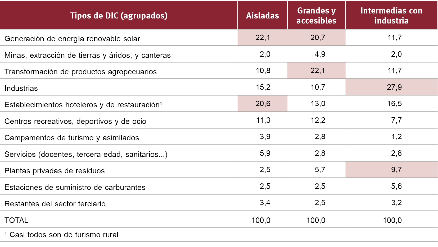 Las áreas interiores, con escasas alternativas económicas, tienen una marcada especialización en uno o unos pocos tipos de DIC de actividades para las que tienen condiciones naturales favorables (energía solar y turismo rural, y, en menor medida, explotación de recursos del subsuelo y determinadas producciones agrícolas) que concentran casi siempre al menos la mitad de todas sus DIC. En cambio, son muy escasas las industriales, así como las terciarias (excepto las de turismo rural), salvo en aquellas comarcas que por disponer de mucho SNUC y una buena accesibilidad a las principales áreas urbanas atraen una parte de la demanda de éstas.