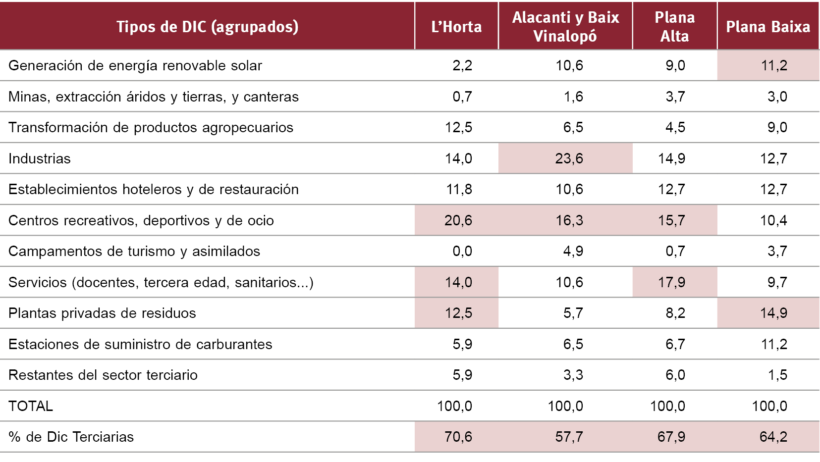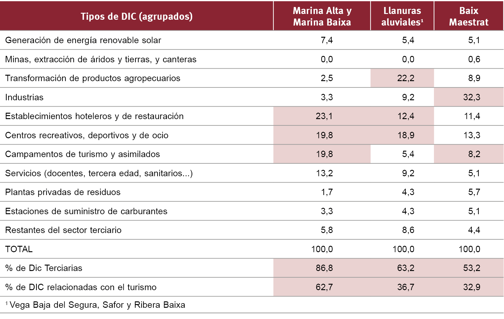 En marcado contraste, las grandes áreas urbanas y el cinturón exterior del AMV tienen una mayoría muy destacada de DIC del sector terciario –la mitad de ellas de servicios y deportivas y de ocio– y un peso notable de las industriales. En el litoral turístico también hay un marcado predominio de las DIC terciarias, la mayor parte relacionadas con el turismo, y cuentan con numerosas DIC de transformación y comercialización de productos agrarios (salvo en la Marina Alta y Marina Baixa), mientras que las industriales solo tienen importancia en el Baix Maestrat y en menor medida en la Safor.