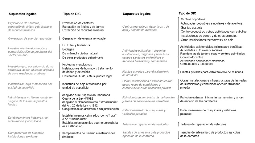 Así, unos tipos de DIC se localizan en relación con las necesidades de la oferta, es decir en las zonas donde esas actividades encuentran condiciones territoriales favorables para su desarrollo. Son las DIC de explotación de recursos del subsuelo, energía solar, transformación y comercialización de productos del primario, campamentos de turismo, establecimientos hoteleros y de restauración de turismo rural y algunas instalaciones deportivas y de ocio.