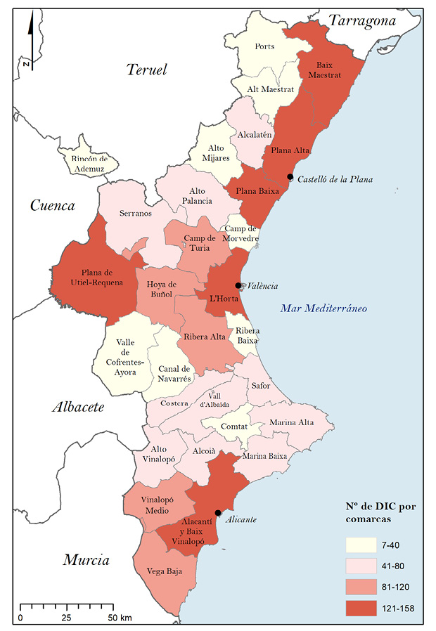 Están presentes en todas las comarcas y en 107 municipios; solo no hay ninguna DIC de este tipo en la muy aislada y de relieve accidentado del Alto Mijares (Castellón) y en la turística Marina Baixa (Alicante) con suelo escaso y caro para estas instalaciones. No obstante, tienen una localización muy predominante en las comarcas interiores donde se sitúan casi dos tercios de ellas, con dos zonas de concentración muy destacadas.