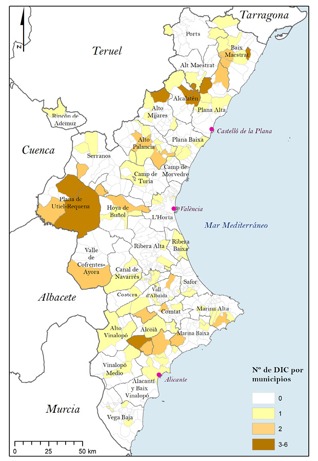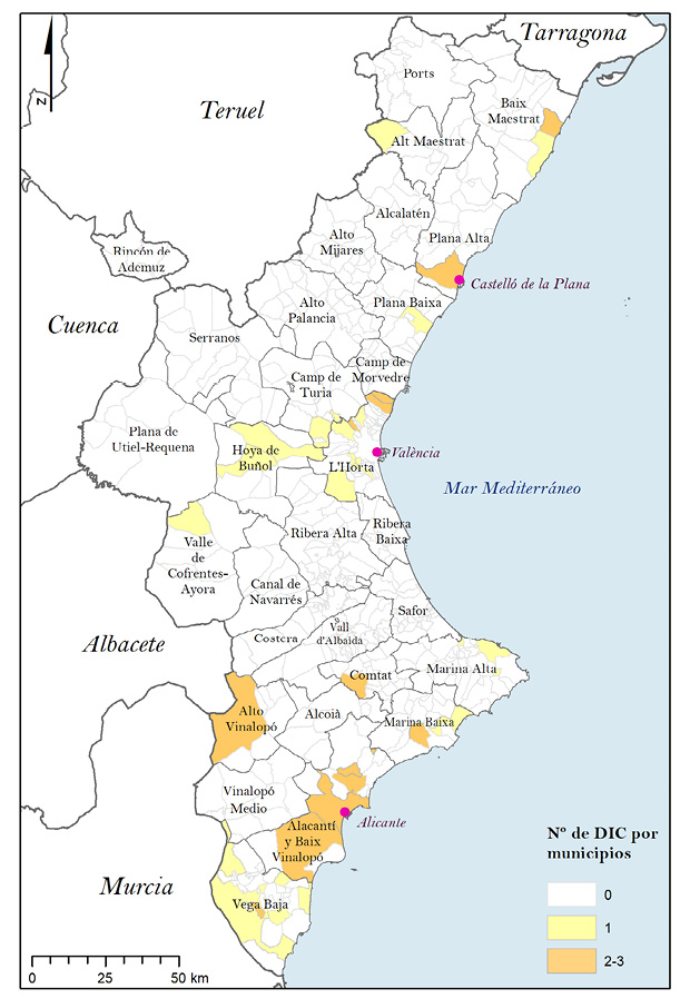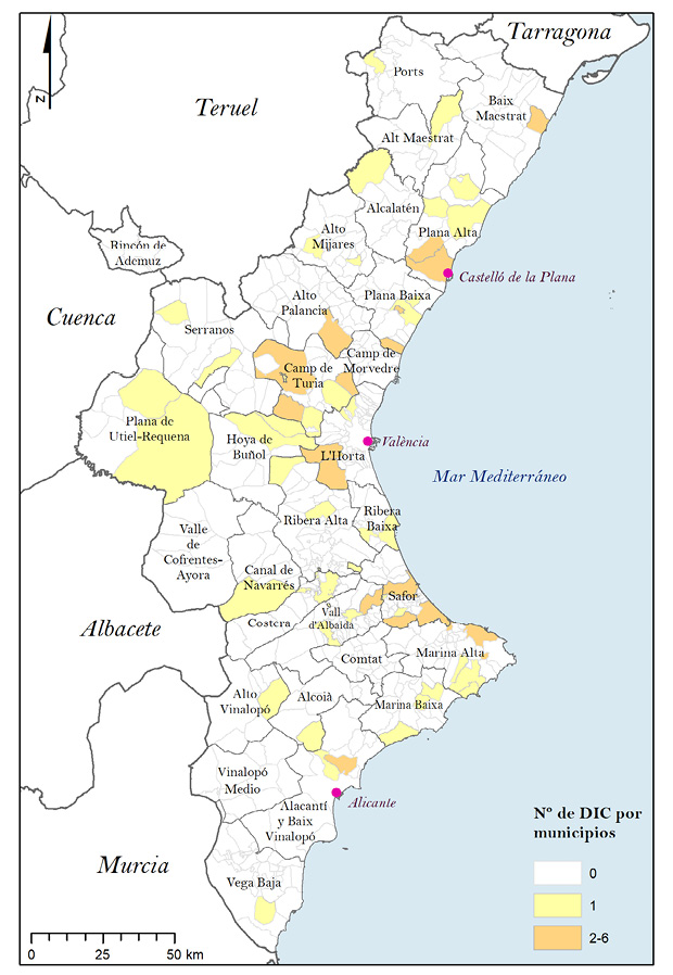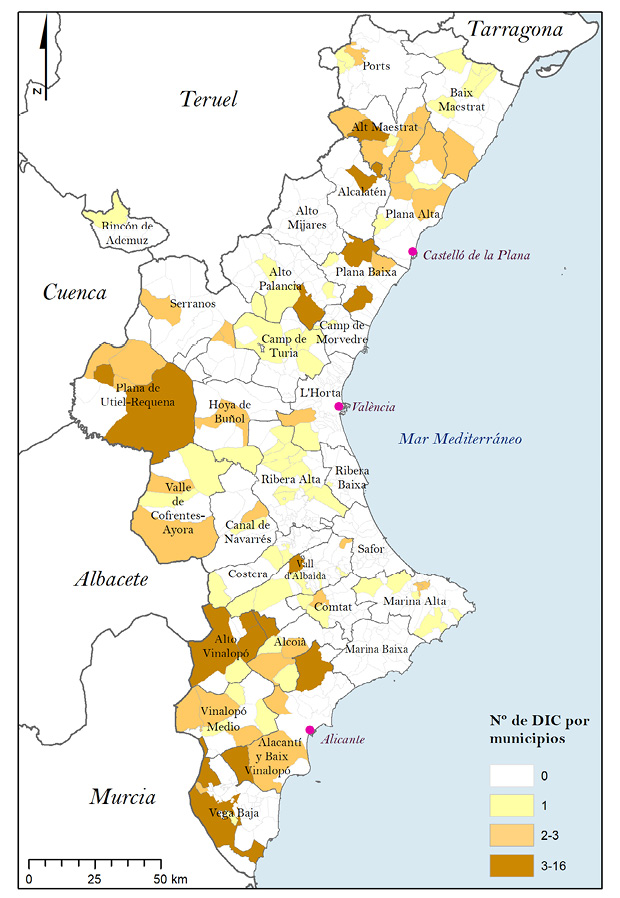 El análisis detallado de las características de los municipios que no tienen ninguna DIC muestra que dos tercios de ellos poseen muy poco SNUC (Suelo No Urbanizable Común), el único en que la normativa permite ubicar una DIC. La mitad de estos municipios carecen por completo de dicho tipo de suelo o éste es muy escaso (<10 ha), sea por su total ocupación urbana (como Mislata y Benetússer en la comarca de l’Horta), sea porque gran parte de su territorio está incluido en espacios protegidos (como los que carecen de DIC en las comarcas de l’Horta en Valencia, Alto Mijares y Alto Palancia en Castellón y el Comtat en Alicante) o bien por las muy pequeñas dimensiones de su término (como los de las comarcas de la Marina Alta en Alicante o de la Safor y la Costera en Valencia). Y la otra mitad de ellos tienen <100 ha de SNUC o la superficie municipal es muy reducida (<5 km2).