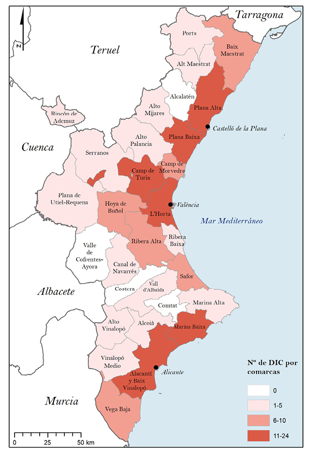 En las extensas comarcas del interior se localizan el 38 % de las DIC, pero con una distribución muy desigual. Así, cinco comarcas suponen más de la mitad de las DIC del interior (Plana de Utiel-Requena y Vall d’Albaida en la provincia de Valencia, Vinalopó Medio y Alto Vinalopó en Alicante y Alto Palancia en Castellón); todas ellas disponen de abundante SNUC y tienen buena accesibilidad desde las áreas urbanas de Valencia o de Alicante-Elx. En cambio, en las otras once comarcas interiores tan solo se ubican el 17 % de las DIC aprobadas. (Fig. 3).