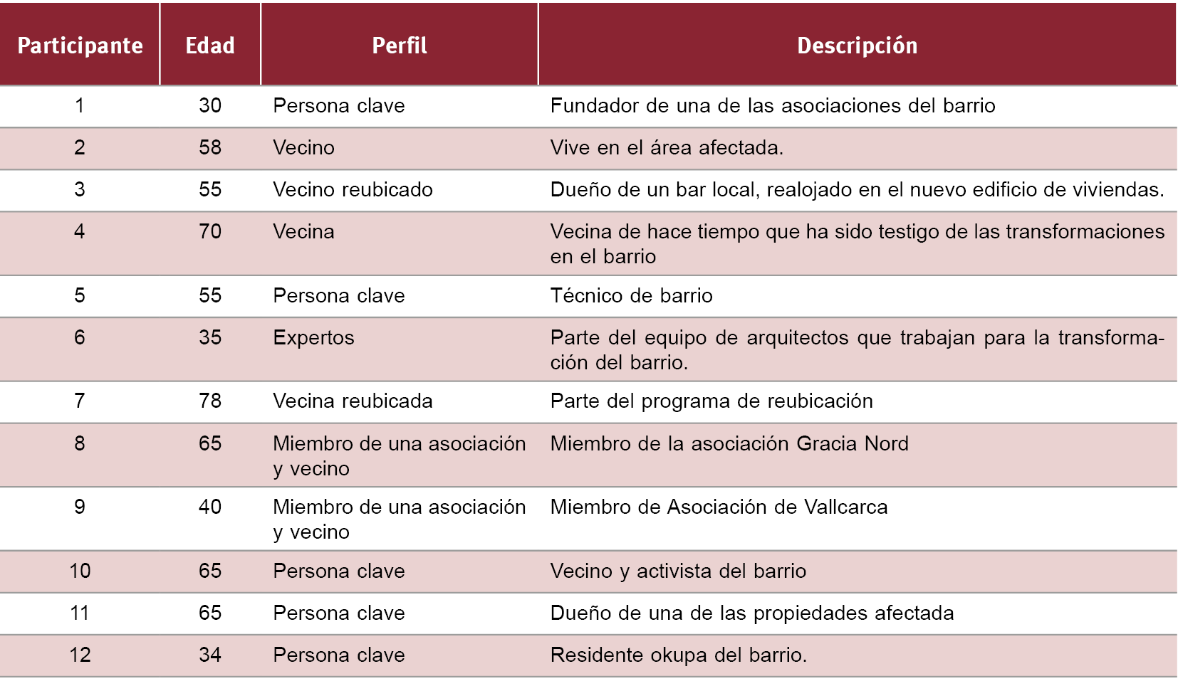 En este caso se utilizó un muestreo intencional, apuntando a la variación máxima (Patton, 2002). La selección de las personas participantes en el estudio se fundamentó en dos criterios: 1) Personas residentes del barrio de Vallcarca; 2) Entidades asociativas del territorio implicadas en la gestión vecinal. A continuación, se describen los perfiles de los participantes: