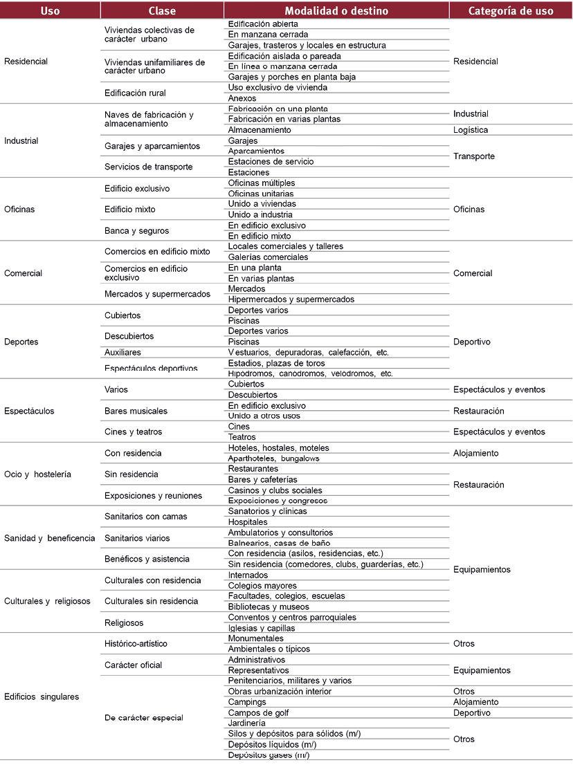 De las tres opciones de clasificación disponibles en el “Clasificador Catastral”, se ha optado por la clasificación avanzada, por cuanto se trata de la clasificación que ofrece una mayor flexibilidad al usuario. Esta clasificación permite definir una serie de clases de usos, agrupando la información más detallada que el catastro ofrece al respecto. En este sentido, para cada construcción, el catastro ofrece datos sobre su tipología constructiva a tres niveles: uso (ej. Residencial), clase (ej. Viviendas colectivas de carácter urbano) y modalidad (ej. Edificación abierta). En el “Clasificador Catastral”, es necesario indicar, a nivel de modalidad, qué elementos integran cada una de las categorías definidas. Para este análisis, se han propuesto 12 categorías diferentes: Residencial; Industrial; Logística; Transporte y asociados; Comercial; Oficinas; Deportivo; Alojamiento; Restauración; Equipamientos y servicios públicos; Espectáculos y eventos; Otros usos. En el Anexo 1 se incluye una tabla detallada con los “usos”, “clases” y “modalidades” que se han asociado a cada categoría.