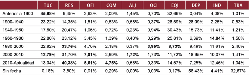 Fig. 7 / Proporción del área que cada categoría de uso representa respecto al total del área cubierta por el conjunto de las parcelas catastrales edificadas o reformadas en cada periodo temporal. Los porcentajes se han calculado sin incluir las categorías “Espacios no edificados” y “Otros lugares”, para facilitar la comparación entre grupos temporales, independientemente de la importancia que en cada uno posean los espacios no edificados (más relevantes en las parcelas registradas en los últimos años) y los “Otros lugares”. En negrita se remarcan aquellos valores más destacados para cada uno de los distritos analizados; es decir, aquellas proporciones más significativas de cada categoría de uso considerada