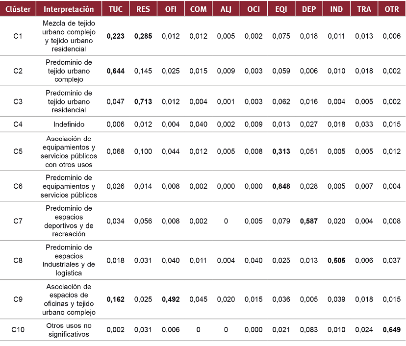A través de un análisis exploratorio, se eligió el número de grupos que permitía clasificar el conjunto de sectores urbanos en el menor número de categorías y mostrando, al mismo tiempo, la mayor variedad de situaciones posible (diferentes tipos o asociaciones de usos). Finalmente, el número de clústeres escogidos fue de 10, asignándose posteriormente una interpretación a cada uso, según el grado en el que la información de cada categoría definía ese clúster (Fig. 4).