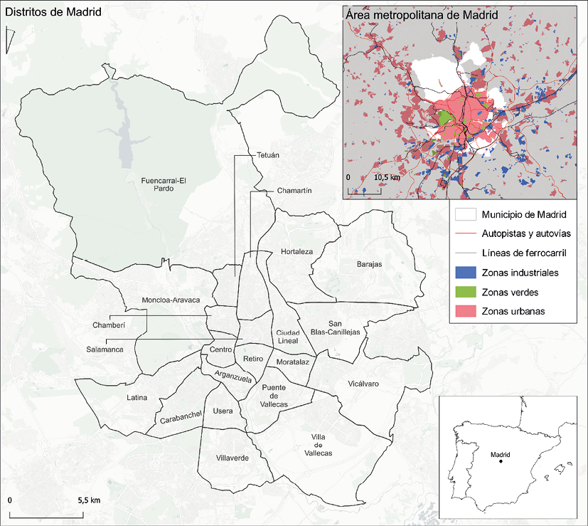 En este estudio, se analiza la complejidad o mezcla de usos en el tejido urbano del municipio de Madrid. Aunque la realidad urbana que conforma el Área Metropolitana de Madrid excede con mucho los límites municipales (Fig. 1), hemos optado por restringir nuestro análisis a los límites del municipio, por cuanto este se corresponde con el ámbito de actuación de las normas urbanísticas de la ciudad de Madrid y, por tanto, del principal instrumento de ordenación y planificación del suelo urbano: el Plan General de Ordenación Urbana (PGOU) (Valenzuela, 2010). A nivel metropolitano, no existe aún ningún instrumento de gobernanza que regule la forma y características de la metrópolis madrileña (Tomàs, 2023), lo que resta relevancia a un análisis de este tipo a tal escala.