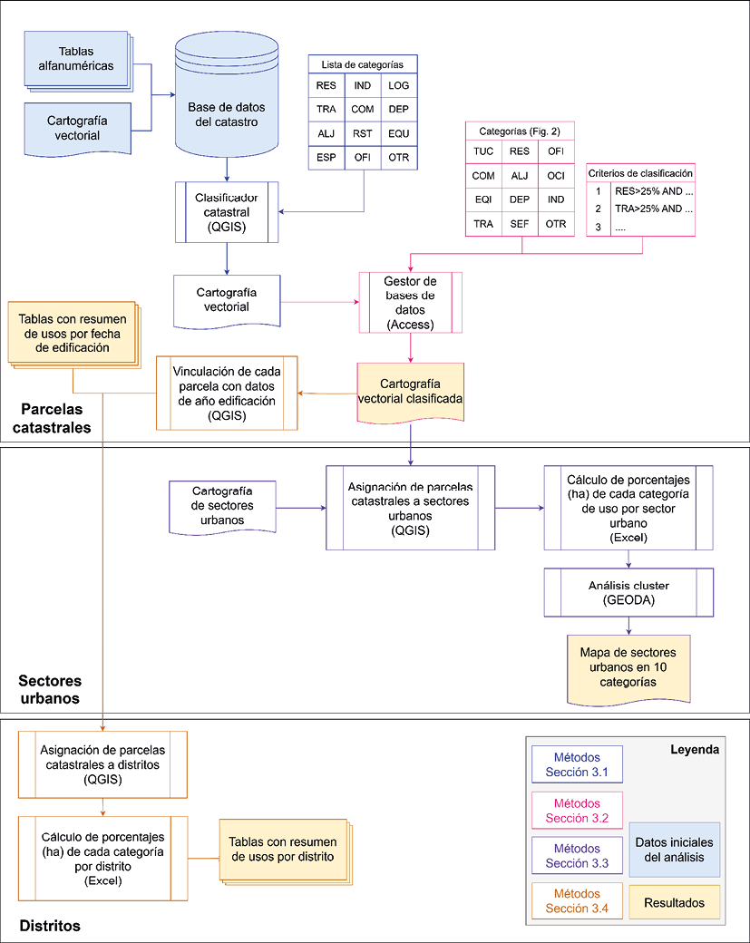El análisis se ha ejecutado en distintas fases, las cuales se describen en detalle a continuación: 1. Tratamiento y sistematización de la información de usos del suelo urbano proporcionada por la base de datos del catastro; 2. Definición de las categorías de usos del suelo urbano objeto de análisis y clasificación de las parcelas catastrales según las mismas; 3. Análisis clúster de los sectores urbanos de Madrid según el tipo de uso predominante; 4. Análisis estadístico de la información a las distintas escalas. La Fig. 2 resume gráficamente el conjunto de métodos que se han seguido para realizar el análisis.
