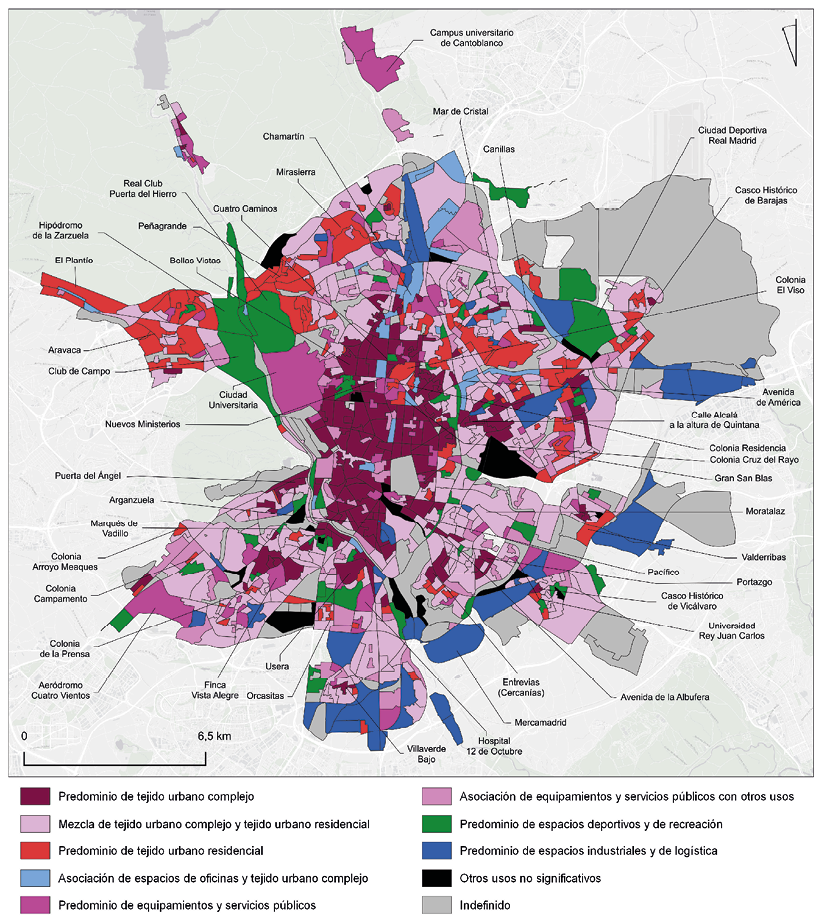 Finalmente, para el caso de Madrid, en la distribución de los distintos usos, especialmente aquellos más zonificados, predomina un claro patrón norte – sur. Al sur se ubican preferentemente todos los usos de mayor rechazo, como los suelos de carácter industrial. No obstante, estos también se localizan al este de la ciudad, en dirección al Corredor del Henares. Al norte, predominan los ámbitos residenciales de mayor calidad ambiental y valor económico, así como los grandes ejes de oficinas. La mayor preponderancia al norte de sectores con usos homogéneos contrasta además con la mayor mezcla de usos que ocurre en el sur de Madrid, donde los retazos de tejido predominantemente residencial tienen una menor extensión, y suelen quedar asociados en sus proximidades a ámbitos de cierta complejidad urbana, donde se mezclan varias funciones. Frente al gran predominio de la vivienda unifamiliar y el bloque abierto residencial ocupando amplias superficies en el norte de Madrid, al sur nos encontramos con un mosaico de pequeñas piezas urbanas, donde la zonificación suele ser fundamentalmente de uso residencial (más allá de los usos industriales en la periferia) y asociada a las principales promociones de vivienda obrera del siglo XX.