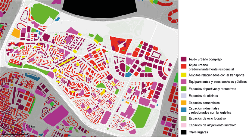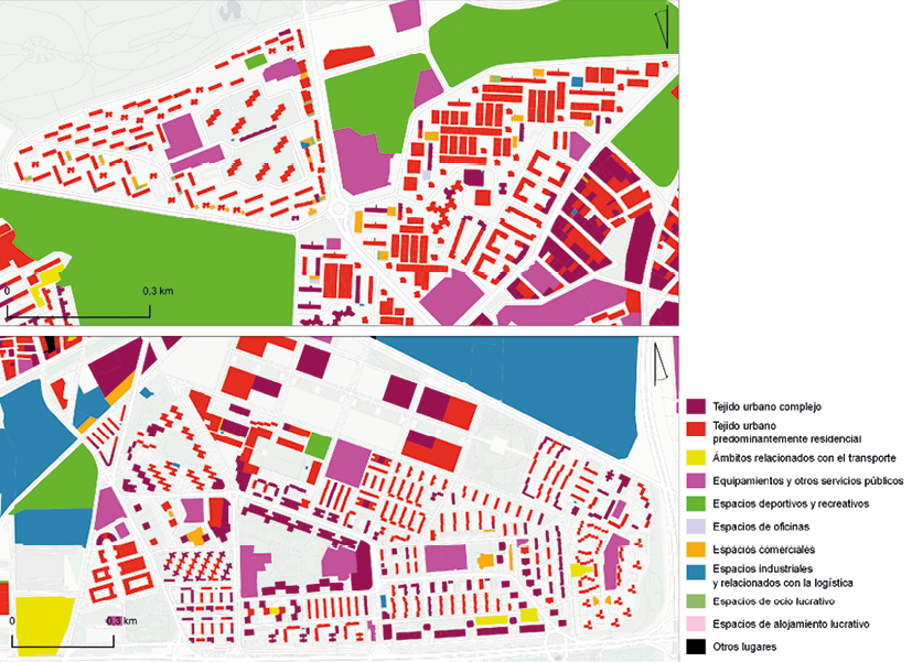 TUC: Tejido urbano complejo; RES: Tejido urbano predominantemente residencial; OFI: Espacios de oficinas; COM: Espacios comerciales; ALJ: Espacios de alojamiento lucrativo; OCI: Espacios de ocio lucrativo; EQI: Equipamientos y otros servicios públicos; DEP: Espacios deportivos y recreativos; IND: Espacios industriales y relacionados con la logística; TRA: Ámbitos relacionados con el transporte.