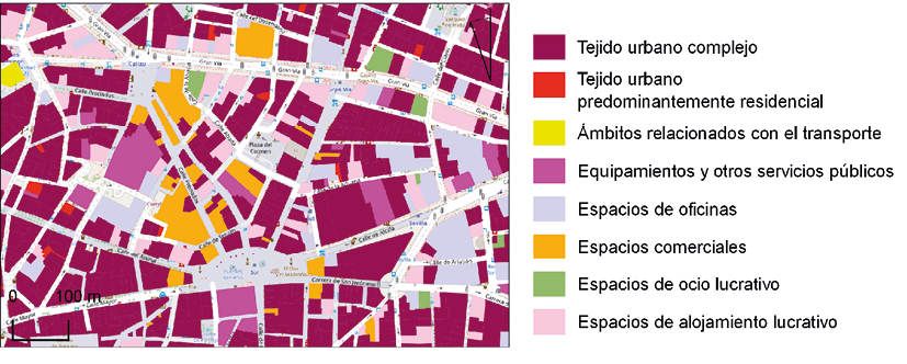 Para definir tejidos urbanos complejos se tuvo en cuenta el significado e intensidad de la asociación entre usos. De esta forma, ciertas parcelas catastrales quedan definidas por una mezcla de usos que, sin embargo, se asocian con una finalidad común. Por ejemplo, en un centro comercial se suelen asociar usos comerciales, de transporte, restauración, espectáculos y logísticos. Sin embargo, el uso conceptualmente dominante y que engloba al resto sería el comercial y, en ningún caso, podríamos hablar de un tejido urbano complejo.