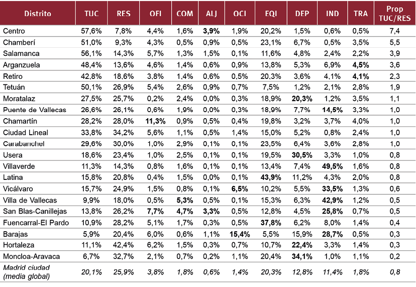 Fig. 5 / Las 10 primeras columnas indican las proporciones del área que cada una de las categorías de uso representan respecto al total del área cubierta por el conjunto de las parcelas asignadas a cada distrito. Los porcentajes se han calculado sin incluir las categorías “Espacios no edificados” y “Otros lugares”, para facilitar la comparación entre distritos, independientemente de si cuentan o no con bolsas de suelo edificable o importantes áreas de usos no comunes, habitualmente clasificados como parte de la categoría “Otros lugares”. La última columna (Prop TUC/RES) indica, para cada distrito, la relación, en superficie, del área de las parcelas catastrales clasificadas como “Tejido Urbano Complejo” (TUC) con respecto al área de las parcelas clasificadas como “Espacios residenciales”. Una proporción de 7.4 indica, para el distrito centro, que por cada hectárea de parcelas clasificadas como uso residencial existen 7.4 hectáreas de parcelas clasificadas como “Tejido urbano complejo”. En negrita se remarcan aquellos valores más destacados para cada uno de los distritos analizados; es decir, aquellas proporciones más significativas de cada categoría de uso considerada