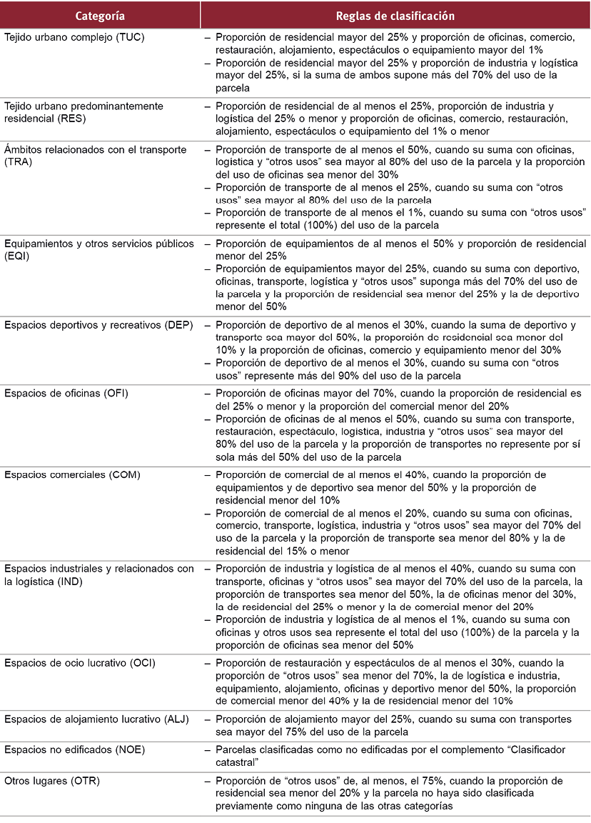 Fig. 3 / Categorías utilizadas para el estudio de la complejidad del tejido urbano de la ciudad de Madrid. Se indican las reglas utilizadas para proceder a su clasificación a partir de las categorías de usos del suelo urbano obtenidas del tratamiento de los datos catastrales (sección 3.1)