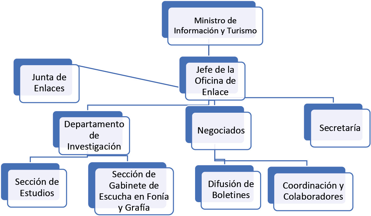 La organización interna de la OE revela una estructura jerarquizada en torno a un jefe con categoría de subdirector general bajo la dependencia directa del ministro, a cuyo cargo se hallaba un subjefe con funciones de suplente y de secretario de la Junta de Enlaces[9]. La Junta de Enlaces era un órgano colegiado integrado por personal de diferentes ministerios interesados en la información que elaboraba este organismo. Entre otros figuraban los tres ministerios militares, Presidencia del Gobierno —bajo la cual se hallaba el Servicio Central de Documentación (SECED)—[10] y Gobernación, del que dependía la DGS. Estos enlaces compartían e intercambiaban información para establecer directrices que seguir en la vigilancia y control de los contenidos mediáticos y de la proyección pública de personal de interés. Se reunían una vez por semana y tenían capacidad para planificar y desarrollar actividades, así como proponer tareas y distribuir información entre los organismos ministeriales concernidos.