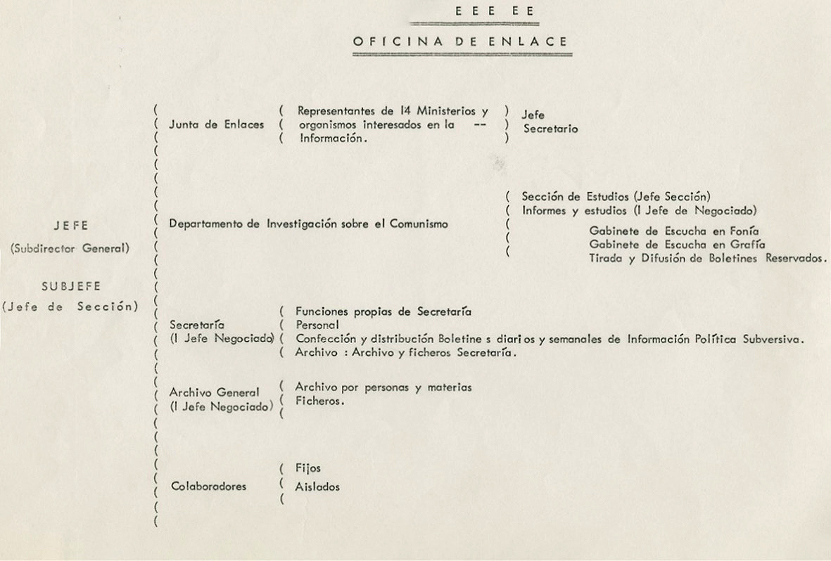 Como se aprecia en este documento de reorganización, se confirma el órgano de la Junta de Enlaces —compuesta por representantes del Alto Estado Mayor, los tres ministerios militares, la DGS, la Guardia Civil, la Organización Sindical, los ministerios de Asuntos Exteriores, Educación, Justicia y Trabajo, el Servicio Central de Documentación y la Secretaría General del Movimiento—; un Departamento de Investigación sobre el Comunismo, que constituía el eje central de las tareas de escucha y de la elaboración de estudios, boletines e informes; los negociados de Secretaría, Archivo y Estudios, y la sección de Colaboradores.