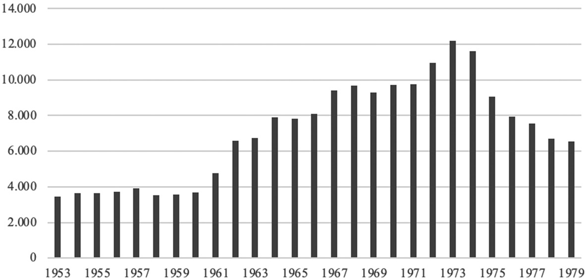 Otro texto, elaborado por quien fuera jefe de la Misión del CIME en Madrid algo más de una década después, Gaspar Gómez de la Serna (1974: 728), menciona que a España habían llegado más de 94 000 refugiados cubanos desde el inicio de la crisis hasta diciembre de 1972, y que de estos, unos 59 000 consiguieron viajar hacia Estados Unidos. Aunque el dato sobrepasa los límites cronológicos de la investigación, da una idea de la envergadura que el fenómeno alcanzó a lo largo de la década. No obstante, si se quiere acompañar estas cifras de una serie continuada que les proporcione mayor sentido, es posible acudir a una fuente como el Anuario Estadístico de España, y en concreto a su estadística de extranjeros residentes en España al final de cada año. En el siguiente gráfico se observa que, después de mantenerse en cifras más o menos estables durante la década anterior, el número de residentes extranjeros de origen cubano asciende notablemente en 1961 y 1962, año en el que supera los 6500, lo que supone un incremento de tres cuartos sobre la cifra de tan solo dos años atrás[26].