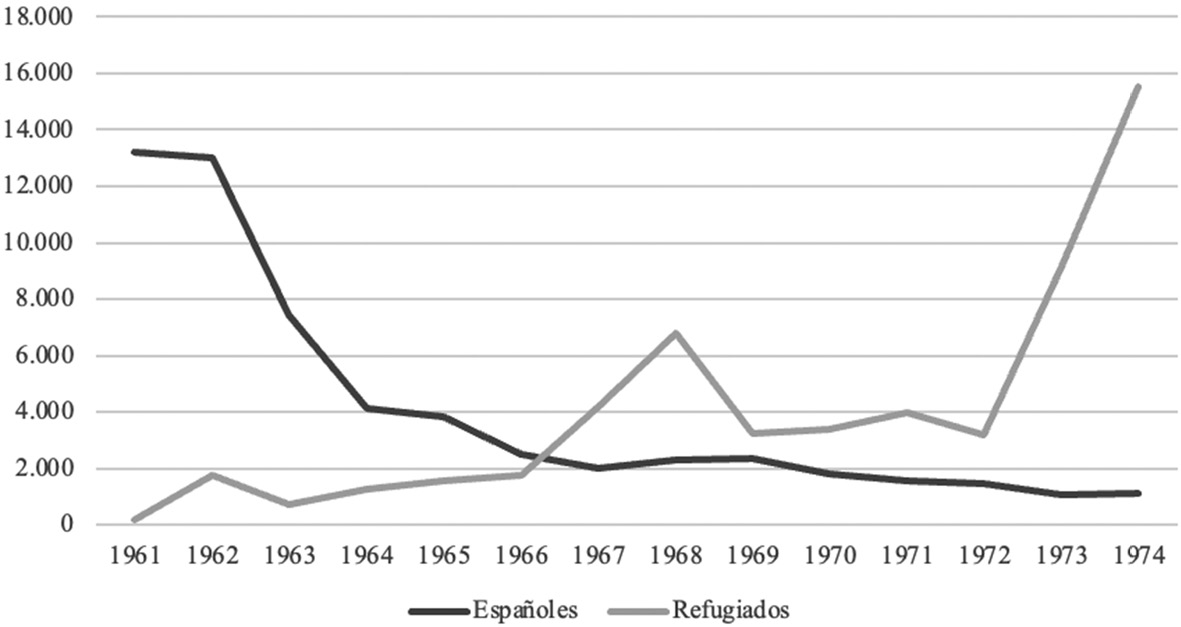 Ahora bien, ¿de qué cifras estamos hablando? El fenómeno no es fácil de cuantificar, sobre todo durante los primeros años, debido a la ausencia de un registro centralizado, un problema ya apuntado en las fuentes de la época[23]. Los estudios elaborados con posterioridad tampoco ofrecen información detallada sobre las primeras llegadas. Así, por ejemplo, la mencionada monografía de Martín y Romano (1994: 25) solo proporciona cifras a partir del año 1964, y en el artículo de García-Montón (1997: 279) no aparecen cantidades anuales hasta 1966. Sobre los años iniciales, solo la bibliografía anglosajona ofrece algunos números, si bien de manera aislada y descontextualizada, como cuando se alude a 10 000 refugiados cubanos llegados a España entre 1960 y 1962[24].